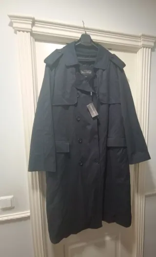 Gabardina elegante de color casi negro. Más oscura que en las fotos. Hace por una 46/48. Ver medidas en fotos. Apenas usada. No envío por correos, sólo punto pack. - Diseño de doble botonadura. - Cinturón para ajustar. - Cuello con solapas.