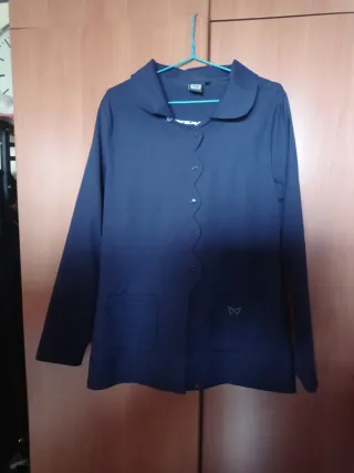 Chaqueta de corte clásico en color azul marino, con remate de solapa ondulada. Tela de gabardina con forro de topos azul marino sobre blanco. Capucha extraíble (botones). - Cuello redondo. - Cierre de botones. - Dos bolsillos delanteros. - Detalle de mariposa en uno de los bolsillos. Chaqueta clàsica y original. Tiene dos o tres usos, està en muy buen estado. Ha estado olvidada en una percha, busca una nueva vida con alguien que la pueda usar.