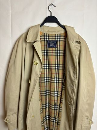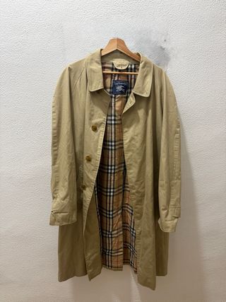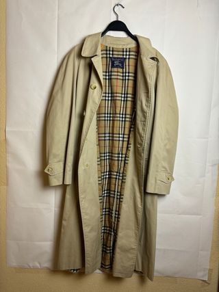 Gabardina clásica de la marca Burberry en color beige, un diseño atemporal. - Estilo trench. - Cinturón con hebilla. - Cuello camisero. - Forro interior a cuadros característico de la marca. Artículo: Gabardina / Trench Coat Clásico y Atemporal Marca: Burberry's (Etiqueta vintage, fabricada en España) Color: Beige/Crema claro (El color icónico de la marca) Estado: Usado, en excelente estado vintage. Presenta desgaste menor acorde a la edad, sin defectos mayores visibles Tejido Exterior: 100% Algodón de alta calidad (ideal como cortavientos/impermeable ligero). Forro Interior: Espectacular forro con el icónico Tartán / Cuadros Nova