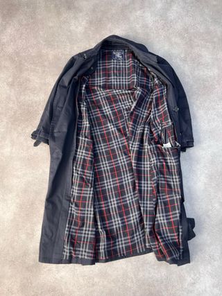 Clásica gabardina vintage de Burberry con el icónico estampado de cuadros en el forro. - Diseño atemporal. - Detalle de cuadros característico de la marca.