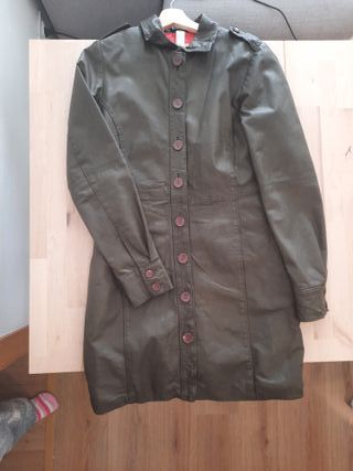 Abrigo de piel/cuero tipo gabardina con cinturón , bolsillos y totalmente forrada. El color es marrón mas bien claro. La talla está entre la T40 y la T42. Está como nueva tanto por fuera como por dentro dado el poco uso que ha tenido.