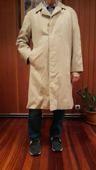 Gabardina clásica para hombre. - Sin roturas , manchas o polilla. Listo para usar. - Color beige. - Recomendado personas hasta 80kg/175cm. - Hecho en Canadá. - Comprado en "Lord & Taylor" de New York. - Cierre de botones. - Bolsillos frontales.