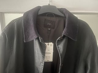 Gabardina larga encerada cuello pana Zara. Manga larga. Bolsillos laterales. Cierre frontal mediante botones ocultos. Talla M-L. Color gris antracita. A estrenar, con etiquetas, nunca usado.