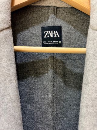 Chaqueta larga de la marca Zara en color gris. Diseño moderno y elegante. - Cuello alto con cierre de botón. - Bolsillos frontales. - Cierre de cremallera.