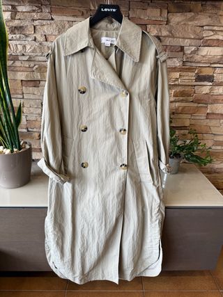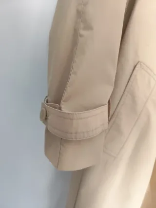 Gabardina beige de largo medio. NOTA: Faltan 3 de los 4 botones delanteros. Venta en persona en Barcelona. - Talla M; corte oversize. - Cintura elástica ajustable en el interior. - Diseño exclusivo de pespuntes delanteros. - Bolsillos delanteros. - Cuello alto y diseño exclusivo de doble cuello. - Mangas largas con puños elásticos. ¡Una chaqueta -ligera y neutra- ideal para la primavera!
