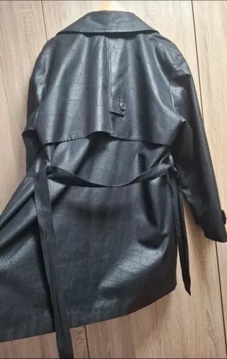 Elegante gabardina larga con un acabado que imita la piel. Vale 120€ - Diseño de doble botonadura. - Cuello de solapa clásico. - Botones dorados. - Corte recto.
