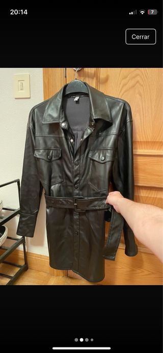 Gabardina o camisa larga con efecto piel. - Diseño tipo gabardina. - Cierre de botones. - Dos bolsillos en la parte delantera. - Incluye cinturón.