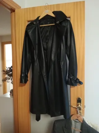 Gabardina larga con acabado de piel sintética. Diseño de doble botonadura, cinturón para ajustar la cintura, puños con detalle de botón. Solapa trasera y raja.