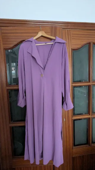 Gabardina larga de color morado, con cinturón. - Diseño con solapas. - Cierre de botón. - Mangas largas. -Material fino Utilizado una sola vez