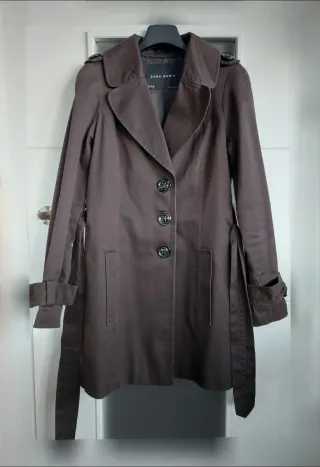 Trench - gabardina marrón de Zara, de largo medio, en talla S (36-38). Es Un clásico atemporal para cualquier ocasión. - Cinturón para ajustar a la cintura. - Puños con detalle. - Dos bolsillos frontales. - Diseño de largo medio (por encima de la rodilla). - Talla S. - Muy poco uso. Medidas: Largo 81 cm Hago envío, también se puede recoger en calle Jaime el Conquistador (28045, cerca de los metros Legazpi y Delicias).