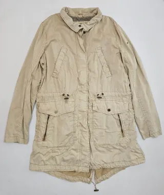 Chaqueta larga tipo gabardina de la marca Esprit en color beige. Presenta un diseño funcional con múltiples bolsillos. - Cierre de cremallera y botones. - Bolsillos frontales con cremallera y solapa. - Cordón ajustable en la cintura. - Cuello con detalle de rayas.