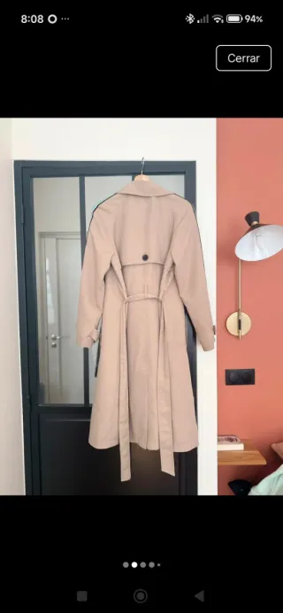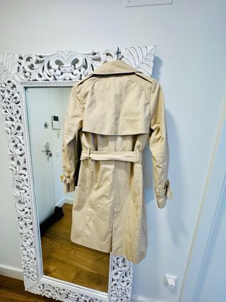 Clásica gabardina de Zara en color beige. Un básico atemporal para cualquier armario. - Diseño de doble botonadura. - Bolsillos frontales. - Puños ajustables con hebilla. En el final de una de las mangas, en el borde, se encuentra un poquito desgastado