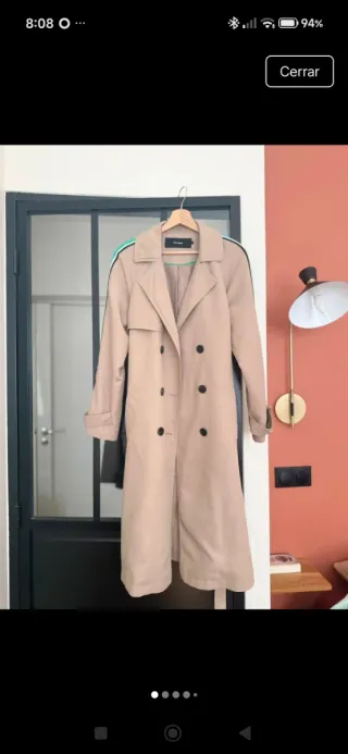 Abrigo tipo gabardina de Mango, largo y elegante. - Solo ha sido usado una vez. - Cierre cruzado con botones. - Cinturón para anudar a la cintura. - Puños ajustables con botón.