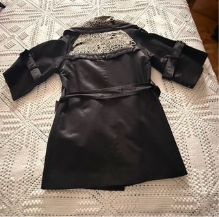 Gabardina reversible con estampado animal print, ideal para añadir un toque único a tu estilo. Es una prenda muy bonita y a estrenar. - Diseño reversible. - Estampado de leopardo. - Cierre de cremallera frontal. - Capucha integrada. - Detalle de cintas blancas y negras en cintura y mangas. medidas sisa 55cm largo 76cm
