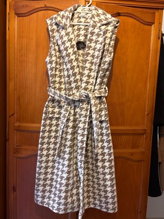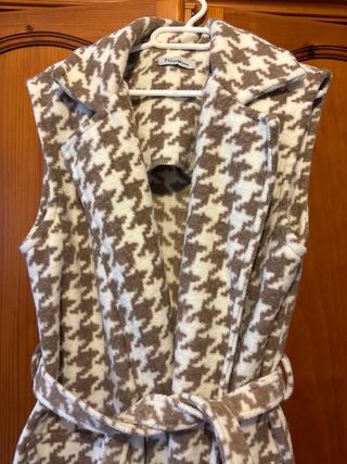 Gabardina sin mangas con un elegante estampado. - Diseño houndstooth en tonos marrones y blancos. - Cinturón a juego para ajustar la silueta. - Cuello solapa. - Bolsillos laterales.