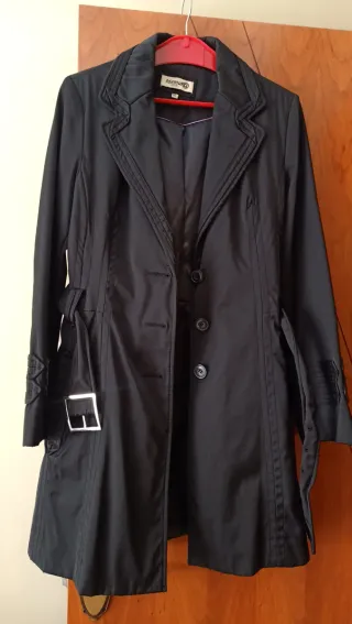 Elegante abrigo tipo gabardina en color negro. Repele el agua. - Diseño con cinturón y hebilla. - Detalles de costura en cuello y mangas. - Cierre de botones.