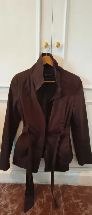 Abrigo tipo gabardina de Mango, largo y elegante. - Solo ha sido usado una vez. - Cierre cruzado con botones. - Cinturón para anudar a la cintura. - Puños ajustables con botón.