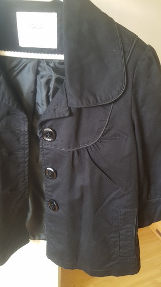 Gabardina negra efecto arrugado con detalles de volantito en mangas, delantero y espalda. Sienta muy bien .