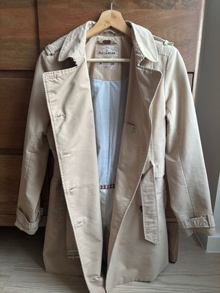 Gabardina de la marca Pull y Bear, talla Xs. Tiene dos bolsillos y conservo los botones de repuesto. Está en muy buen estado (solo la usé una vez).