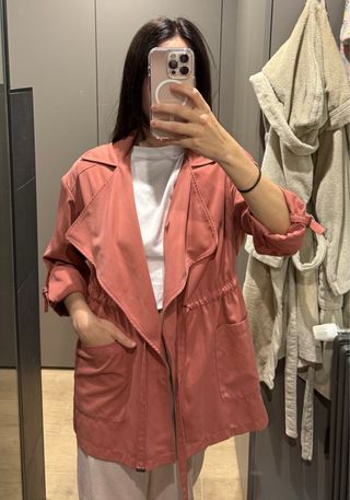 Preciosa chaqueta tipo trench de Stradivarius, en color rosa y talla S. Está sin usar, así que está impecable. - Diseño elegante y versátil. - Cierre con cinturón. - Bolsillos funcionales.