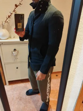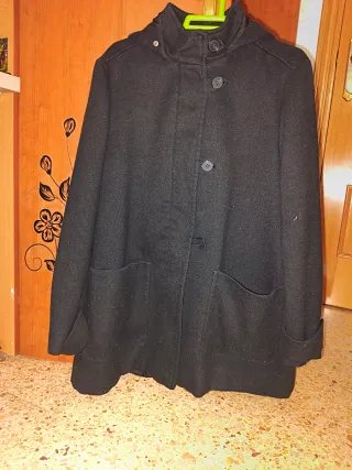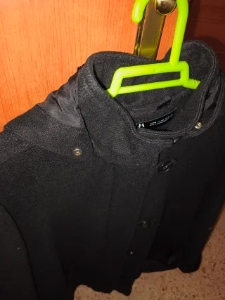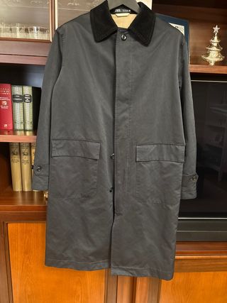 Gabardina de la marca Zara en color negro y azul talla S. Un básico elegante para cualquier ocasión. (COMO NUEVA) - Cuello de pana. - Cierre de botones. - Dos bolsillos frontales.