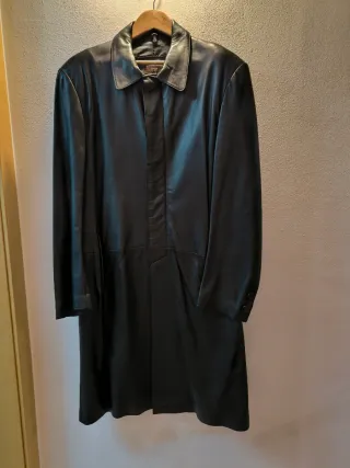 Elegante gabardina de piel. - Material: Piel. - Color: Negro. - Diseño clásico con cuello. - Cierre frontal.