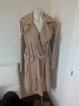 Gabardina de mujer sin estrenar, con un diseño moderno y detalles de color en las mangas, con cinturón.Da mucha talla. Medidas; - de sisa a sisa:60 cm - largo : 102 cm - Diseño tipo trench. - Cinturón para ajustar. - Bolsillos frontales. Marca Zara Nueva, con etiqueta. Precio en tienda:59.95€ Precio Wallapop; 29.95€