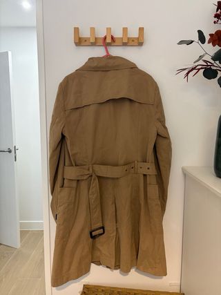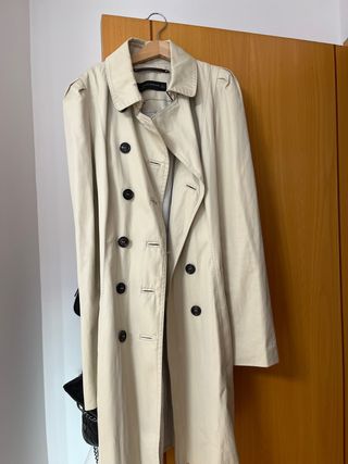 Gabardina clásica de Zara en color beige. Un básico atemporal para cualquier armario. Tiene un ligero descosido en el forro por eso el precio. Poco uso. - Diseño cruzado con doble abotonadura. - Cinturón ajustable a la cintura. - Cuello con solapas. - Puños con trabillas y botones.