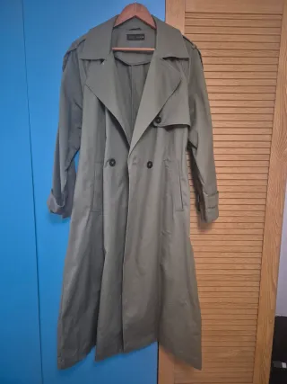 Gabardina de la marca Zara en color verde y talla M. Un clásico para cualquier armario. - Diseño tipo trench. - Cinturón para ajustar. - Doble abotonadura. - Cuello con solapas.