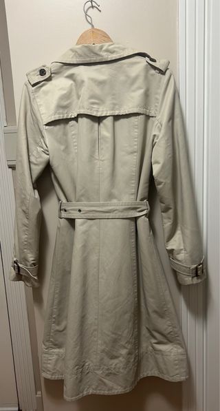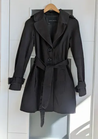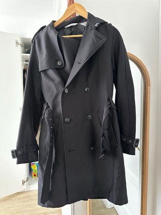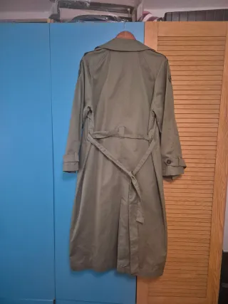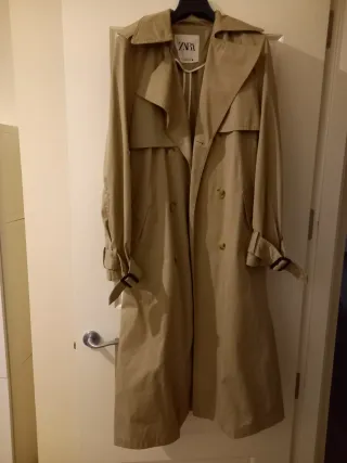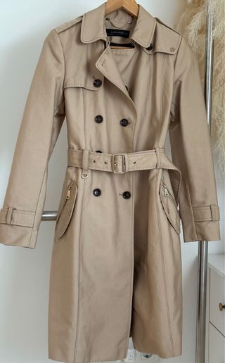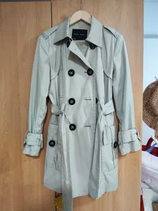 Gabardina clásica de Zara para mujer. - Diseño de doble botonadura. - Cinturón ajustable a la cintura. - Puños con trabillas. - Cuello con solapas. A pesar de ser una talla S, talla muy grande, más similar a una talla M.