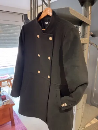 Elegante abrigo de paño de la marca Zara. - Diseño de doble botonadura. - Botones dorados. - Cuello alto. - Bolsillos frontales.