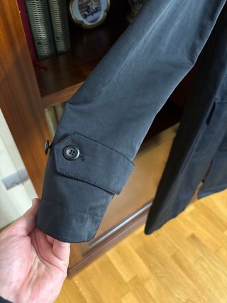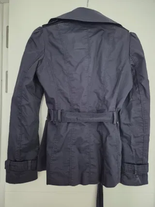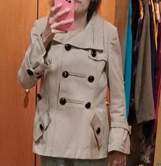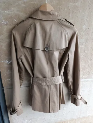 Abrigo corto de estilo gabardina, no tiene defectos ni manchas ni roturas - Doble botonadura con botones dorados. - Bolsillos frontales con solapa. - Cuello solapa clásico. - Puños anchos con detalle.