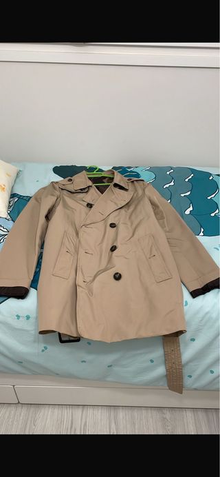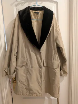 Gabardina de Zara en color beige, talla 10). Es una prenda versátil y elegante. - Diseño clásico de gabardina. - Forro interior de borreguito para mayor calidez. - Cierre de botones. - Bolsillos frontales.