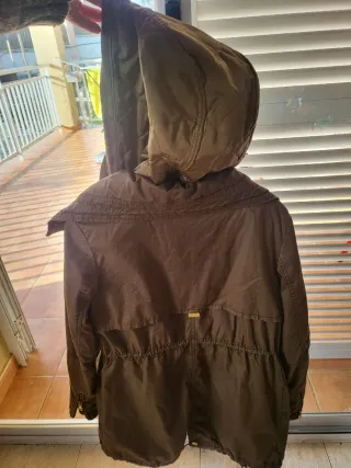 Gabardina de la marca Zara en color verde oliva. Ideal para un estilo casual. - Cierre de cremallera y botones. - Capucha. - Cintura ajustable con cordón. - Bolsillos delanteros.