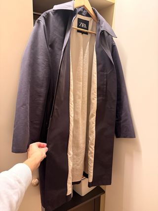 Elegante gabardina de Zara en color azul. Un básico versátil para cualquier ocasión. - Cierre de botones. - Cinturón para ajustar. - Bolsillos frontales.
