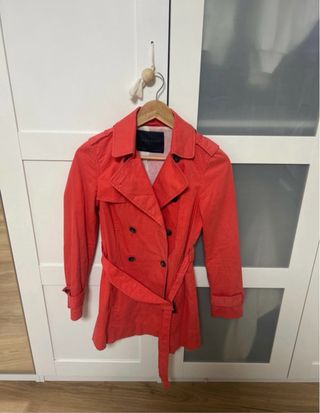 Gabardina de la marca Zara en color rojo, completamente nueva. - Diseño clásico de gabardina. - Cinturón a juego para ajustar la cintura. - Doble botonadura frontal. - Puños ajustables con hebilla.