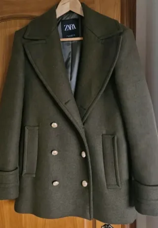 Gabardina de Zara en color verde militar. Talla L pero equivale a una M. - Diseño de doble botonadura. - Cuello con solapas. - Puños ajustables con trabilla. - Bolsillos frontales.