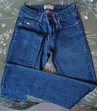 Pack de dos pantalones tejanos con un regalo de gabardina. - Dos pantalones tejanos. - Una gabardina de regalo. *La gabardina tiene la tela con signos de guardado. No se nota apenas, pero de estar guardada tiene como pequeñas zonas con el color un poco alterado ( puntitos). El Pack son de 2 tejanos talla 34 de Inside. Regalo la chaqueta tipo gabardina talla S de la tienda Stradivarius. Ha tenido muy poco uso.