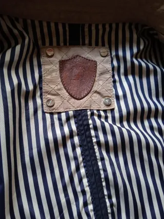 Chaqueta corta estilo gabardina con forro a rayas. - Detalle de escudo en la parte trasera. - Cierre con botones metálicos.