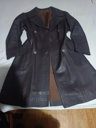 Gabardina clásica de cuero genuino. - Material: Cuero genuino. - Diseño atemporal. Estuvo guardado mucho tiempo en el armario el forro está desgastado principalmente en la manga derecha ,presenta una rasgadura como figura en la foto es pequeña que puesto no es notorio es un cuero grueso con caída que amolda la figura es lindo corte corazón . Porfavor ver bien las fotos , no acepto devoluciones, no tiene marca no etiqueta de talla pero yo soy M exacto y me da . Igual pongo las medidas . Hombros 44 cm Pecho 49 Cintura 43
