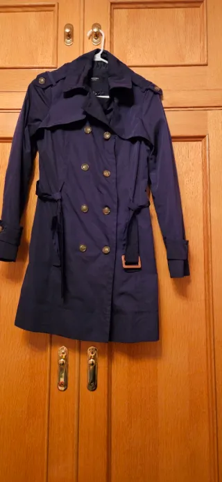 Gabardina azul marino de mujer, talla S pero da una M, de Cortefiel, cierre con botones dorados en delantero