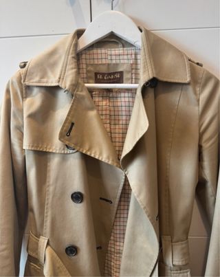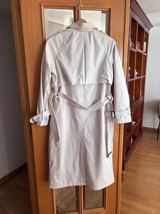 Gabardina de corte clásico en color beige. - Cierre de botones. - Cinturón ajustable en puños y cintura. - Solapas de muesca. - Usada, pero en buenas condiciones