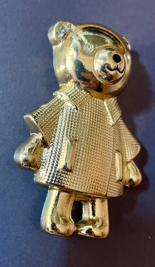 Este encantador broche tiene la forma de un oso con una gabardina. - Detalle de pedrería en las orejas y alrededor de los ojos. - Acabado brillante. - Diseño de gabardina con bolsillos.