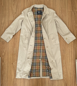 Gabardina clásica de la marca Burberrys, un icono del estilo old money. - Diseño atemporal. - Detalle del icónico estampado Nova Check en el forro y cinturón. - Color beige versátil.
