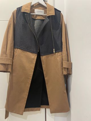 Gabardina de Bimba y Lola con un diseño moderno y versátil. Como nueva apenas uso,perfecta para fondo de armario, medidas largo 84 y ancho 44 aprox,talla xs, 36. Corte ajustado. - Combinación de tejidos en color marrón y gris. - Cierre frontal con cremallera. - Cuello camisero. - Mangas largas con puños enrollados.