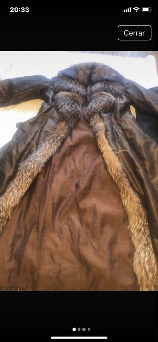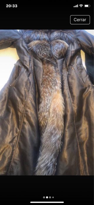 Elegante gabardina con un diseño único. -Tiene defectos por el uso, de ahi el precio. Es zorro autentico. - Acabado en piel. - Detalles de pelo en cuello y mangas. - Forro interior de satén.