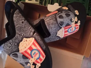 Pantuflas con un divertido diseño de temática cinematográfica, perfectas para los amantes del cine. - Estampado de carretes de película, gafas 3D y cubos de palomitas. - Detalle de palomitas - Base antideslizante.