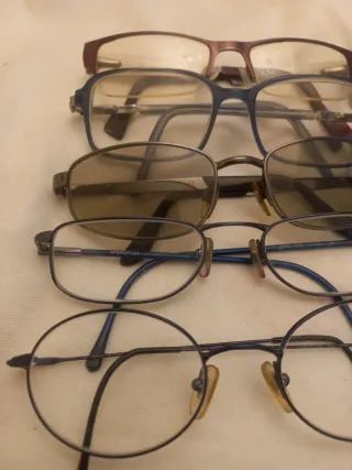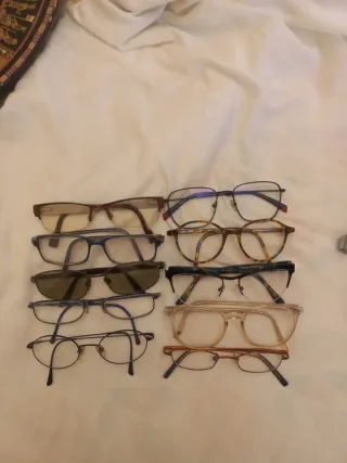Lote de monturas de gafas de diferentes estilos y colores. - Monturas de metal y pasta. - Diseños variados para hombre y mujer. - Incluye monturas de color negro y marrón -10€ cada una