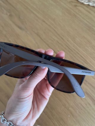 Gafas de sol estilo parecido a aviador de la marca Carrera. Montura metálica con patillas negras. Tiene unas pequeñas marcas en el cristal que se aprecia en la foto pero no afecta a la visión