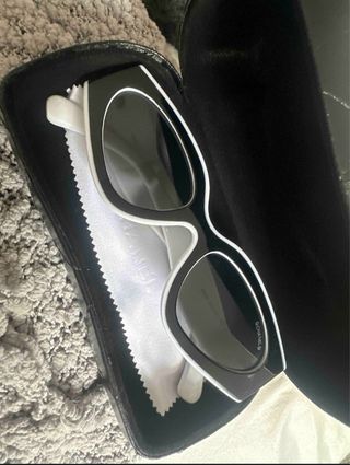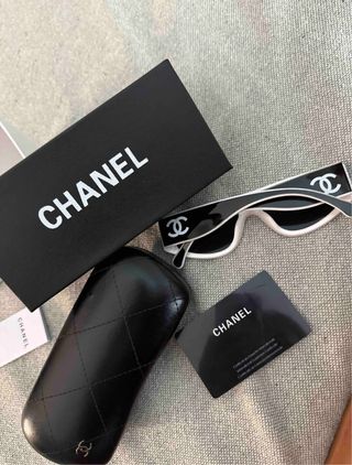 Elegantes gafas de sol Chanel con un diseño moderno. - Montura en contraste blanco y negro. - Lentes con protección UV. - Incluye funda y caja original.